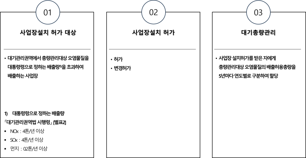 - 오염물질별 지역 목표 대기질 달성을 위해 연간 배출 한도(총량)를 산정한 후 사업장별로 배출량을 할당하여 그 범위 내에서 오염물질 배출하도록 하는 사전 예방적 관리제도